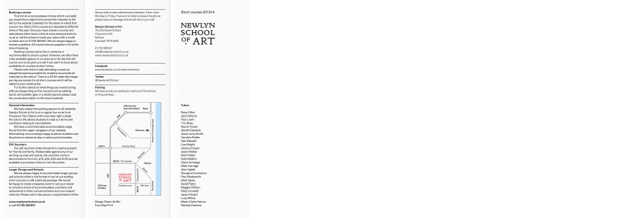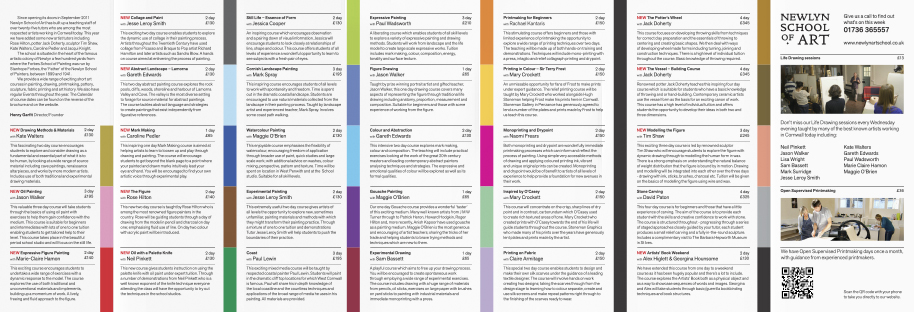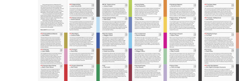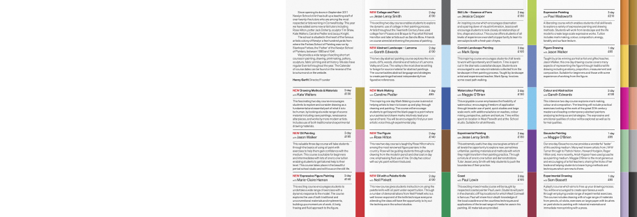 of Newlyn, Cornwall. It offers an array of courses in disciplines including; painting, drawing, printmaking, pottery, stone carving and fabric design. These courses are taught by over 30 of the most well known artists working in Cornwall today.